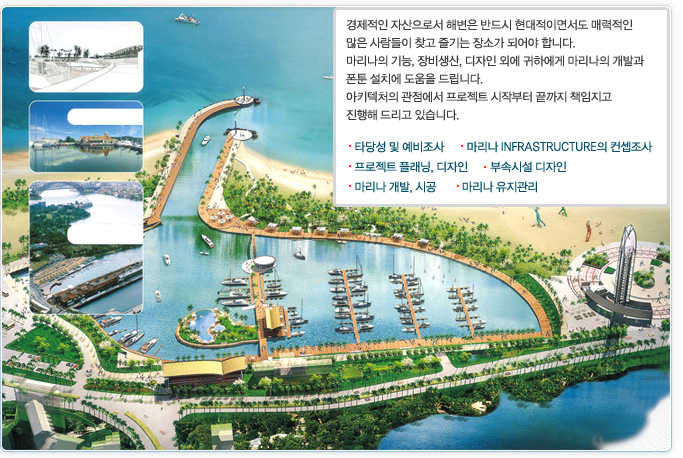 마리나 프로젝트의 진행에 필요한 기초조사, 마스터플랜제안, 컨셉설계, 실시설계와 시공까지 토탈 마린 컨설턴트로서의